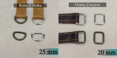 Kısaca çanta malzemelerinden bahsedecek olursak: D halka ve çerçeveler; çanta kenarları gibi yerlerde kanca ve askı takmak için kullanılır. Kullanacağınız deri genişliğine göre temin etmeniz gerekir.